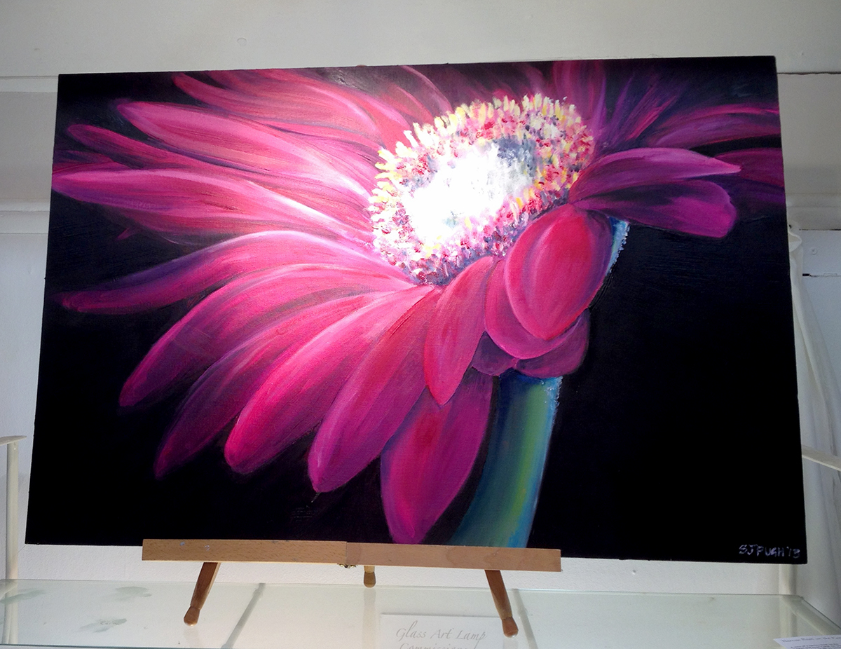 This stunning oil on board painting of a Gerbera is the latest flower picture from Serena.  Highlighted with one of the spot lights it really brings a lovely burst of colour into the gallery.