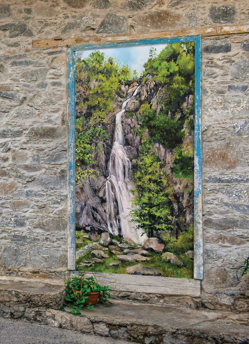 A recent project which she very much enjoyed working on was to paint Aber Falls in Gwynedd, North Wales. The work was to go on an outside wall and was to cover an old doorway measuring 36” x 60”. As the weather can be a little inclement up there we had to come up with a way to make it weather proof.