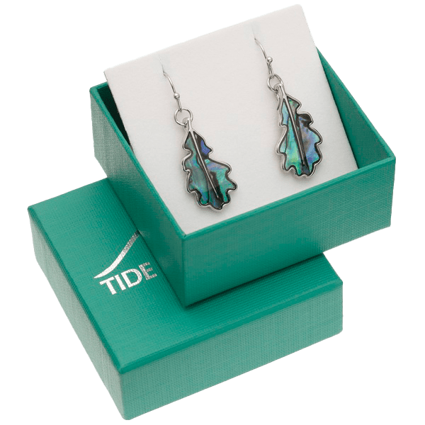 Inlaid Paua shell Oakleaf hook earrings. Come in presentation box with earring insert. Size 25mm.