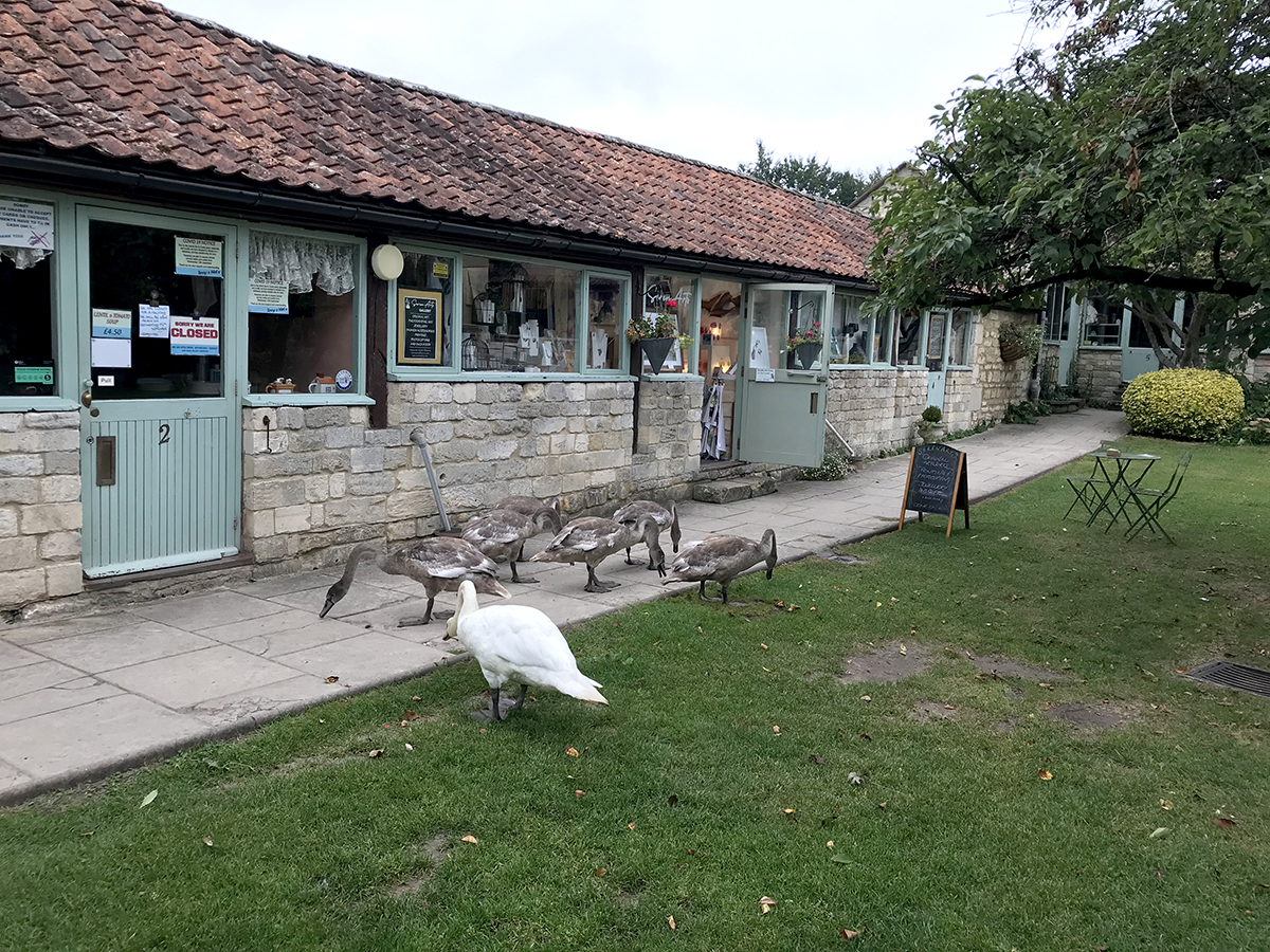 On my morning walk today I saw a mother swan and her six signets grazing on the grass behind the Tithebarn Workshops, so I quickly phoned Serena to go and have a look. The next thing I know I get a rather panicked phone call from her saying they were following her back into the garden of the Workshops! I think word might have got around in the bird world that Serena feeds them every morning!